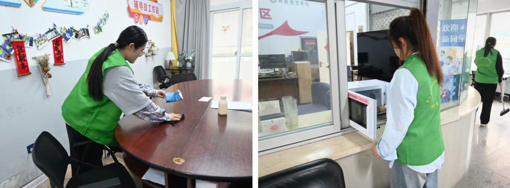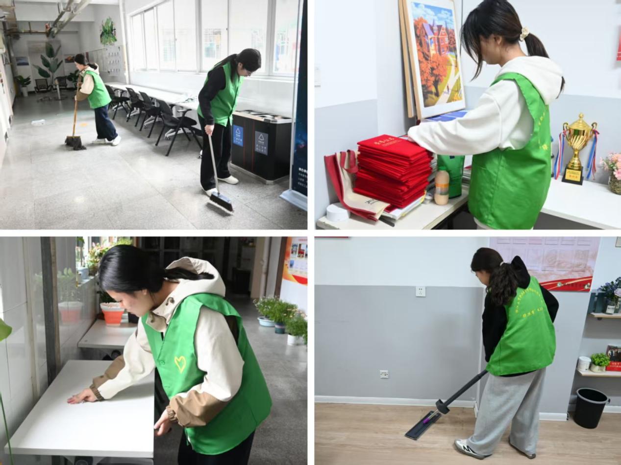 活动伊始,同学们精神饱满地集合报到,根据任务分区领取了清洁工具。大家以高度的协作精神,分区域同步开展清洁工作,围绕学院“一站式”学生社区服务大厅、F1幢公寓楼、E幢公寓楼三大重点区域,有序开展地面清扫、公共设施擦拭、垃圾杂物清理、桌椅物品规整等工作,对服务窗口、走廊扶手、楼道转角等卫生死角进行细致清理,不留一处盲区。