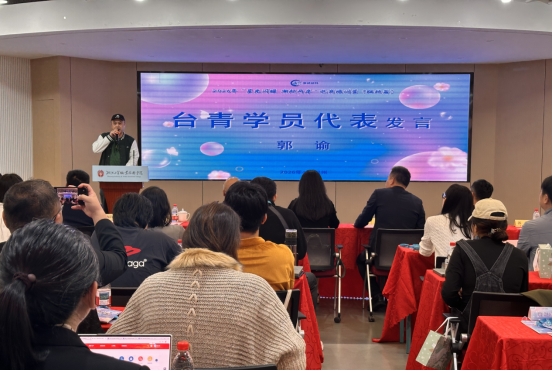 台湾青年代表郭谕发言。他对两岸青年相聚温州表示欢迎,指出本次电商学习是技能提升的契机,更是两岸青年互学互鉴、携手成长的旅程。两岸学员将共同探讨直播带货、短视频运营、跨境电商等前沿话题,分享市场经验与实战心得。他鼓励学员积极交流、碰撞灵感、缔结友谊,坚信电商未来属于协作创新的青年,祝愿学员学有所用、创业就业顺利,预祝培训营圆满成功。