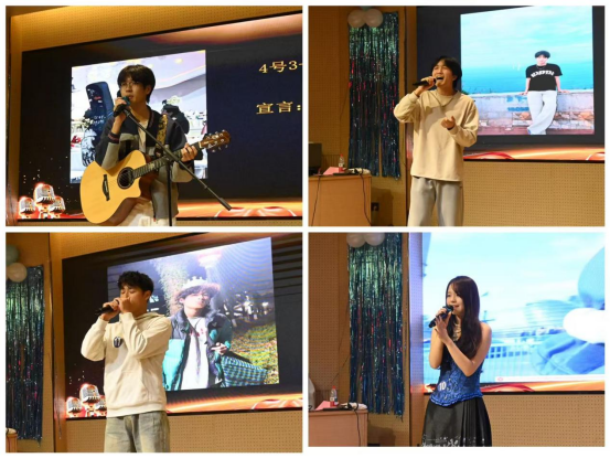 最后环节,10位选手结合个人风格精心选曲,展开巅峰对决。3+2营销2501班林懿轩带来吉他弹唱版本的《谁》,电商2402班王振宇活力演唱《改变自己》,国贸2501班何文浩深情演唱《瞬》等,现场气氛异常热烈。选手们以演唱传递真挚的情感力量,展现出独特的音乐魅力与青春风采。舞台上灯光璀璨,他们尽情释放才华;舞台下观众专注聆听,不时挥舞荧光棒为选手加油,现场宛如一片充满音乐与热爱的海洋。