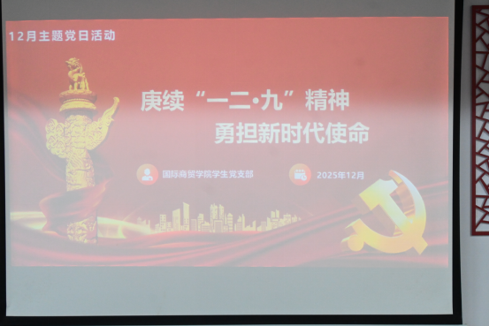 为纪念“一二·九”运动,厚植师生爱国情怀,2024年12月22日,国际商贸学院学生党支部在AB栋党员之家举办“赓续‘一二·九’精神,勇担新时代使命”主题党日活动。支部全体党员及13名入党积极分子参加。