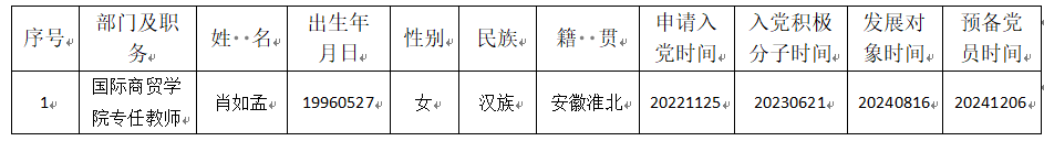 根据《中国共产党发展党员工作细则》有关规定,经国际商贸学院跨境贸易专业群党支部研究,拟将肖如孟同志转为中共正式党员,现将其基本情况予以公示。在公示期限内,欢迎广大党员、干部、群众通过信函、电话或直接到党支部或上级党委部门反映公示对象在预备期间思想品质、现实表现、廉洁自律等方面的情况。